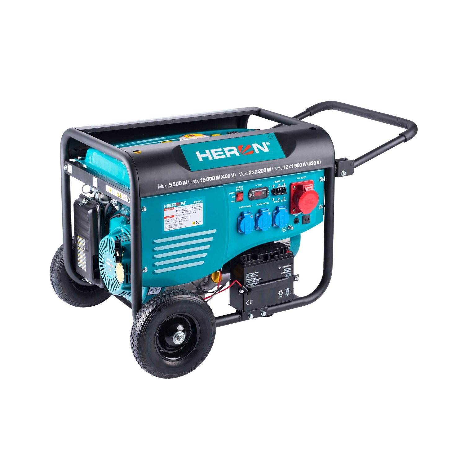Heron benzínová elektrocentrála 13HP/5,5kW/6,8kVA (400V) 2x2,2kW (230V) s podvozkem a el. startem