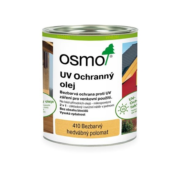 Osmo UV Ochranný olej 410 je bezbarvý polomatný ochranný nátěr na dřevo na bázi přírodních olejů k použití ve vnitřních i vnějších prostorách.
