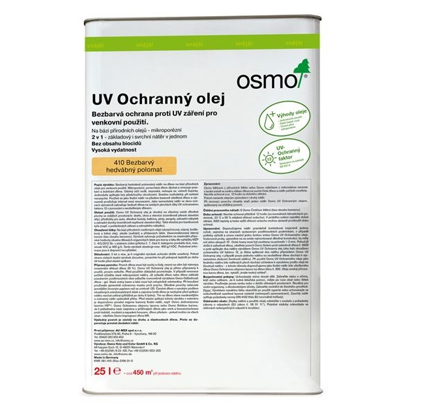 Osmo UV Ochranný olej 410 je bezbarvý polomatný ochranný nátěr na dřevo na bázi přírodních olejů k použití ve vnitřních i vnějších prostorách.