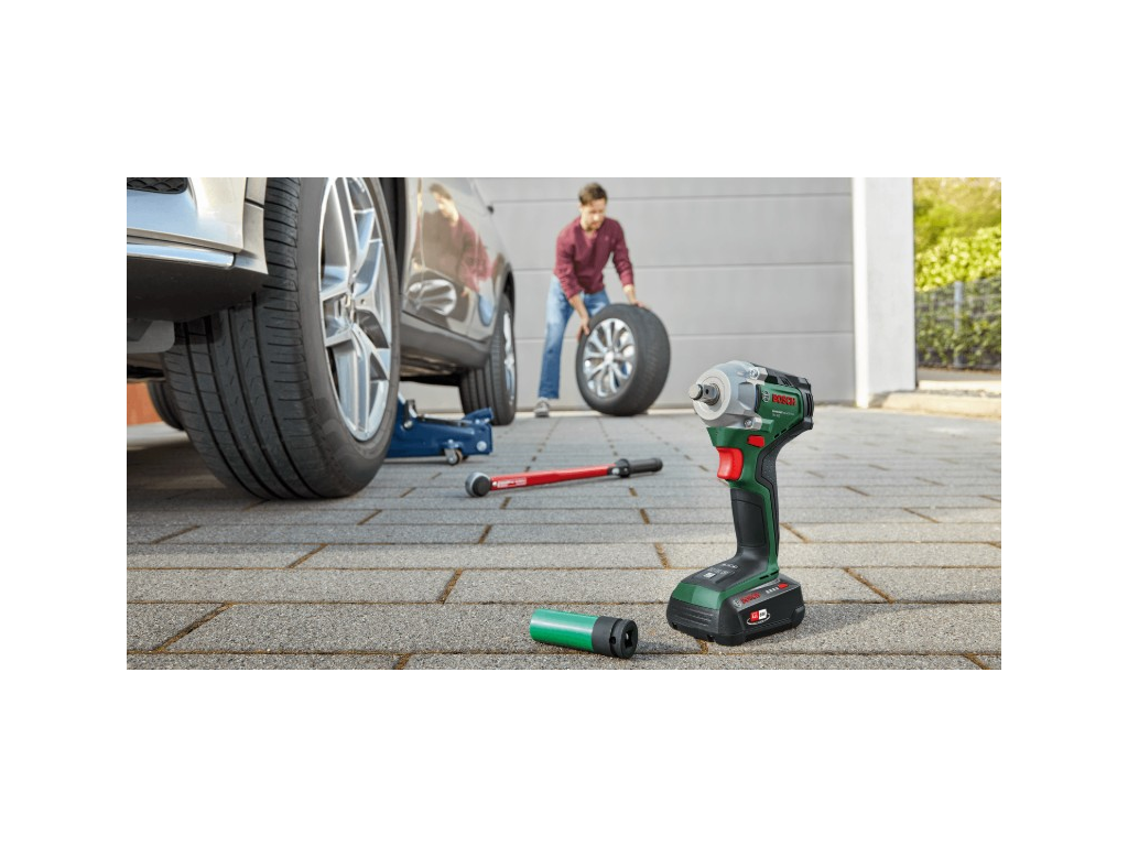 Při výměně kol vám Bosch UniversalImpactDrive 18V-350 usnadní život. Tento akumulátorový rázový utahovák má 3 nastavení otáček a krouticího momentu, poskytuje max. točivý moment 350 Nm a max. 3 400 rázů za minutu. Díky tomu je výkonný a všestranný při práci se zatvrzelými maticemi kol, odstraňuje staré nebo rezavé šrouby nebo snadno utahuje velké šrouby do dřeva. Tento rázový utahovák s 1/2" vnější čtyřhrannou hlavou lze vybavit řadou kompatibilních nástavců, takže je vhodný pro různé úkoly. Technologie bezuhlíkového motoru zajišťuje vyšší výkon a delší životnost nástroje. Rázový utahovák se díky své kompaktní konstrukci snadno přenáší a je ideální pro práci nad hlavou. Vestavěná elektronika Bosch Syneon chrání nářadí i akumulátor. Toto nářadí patří do systému 18V POWER FOR ALL. Jeden akumulátor lze používat s veškerým nářadím 18V POWER FOR ALL.