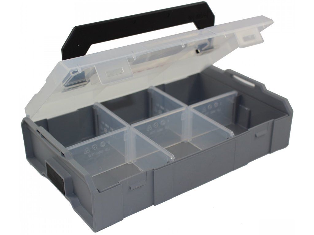 Značkový box Bosch vám umožní přehledně skladovat nářadí a jeho příslušenství, čemuž napomáhá i průhledné víko pro lepší přehled a rozdělení do šesti přihrádek. Rukojeť a bytelné zpracování pak zajistí snadný transport.