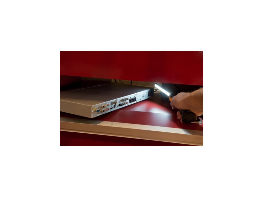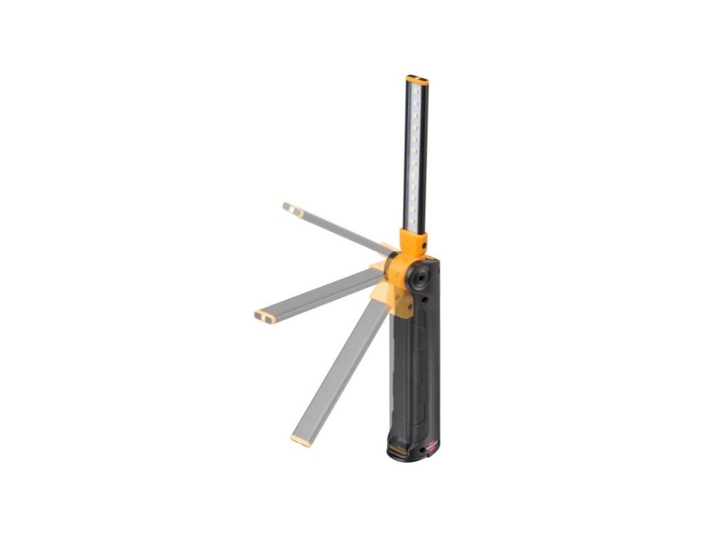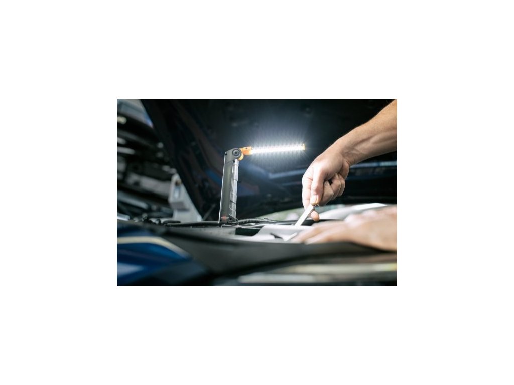 Akumulátorová ruční LED lampa SANSA 400 A je extrémně štíhlá a úzká pracovní LED lampa s integrovanou Li-Ion baterií 3,7 V /2,0 Ah a indikátorem nabití. Díky pogumovanému povrchu se dílenská lampa LED ideálně drží. Pomocí integrovaných magnetů a rozkládacího háčku lze inspekční lampu flexibilně používat, a tím zajistit volné ruce při plném světelném výkonu. Světelný výkon se individuálně nastavuje pomocí žlutého kolečka na tělese svítidla - to umožňuje dokonalé stmívání pro každou aplikaci.