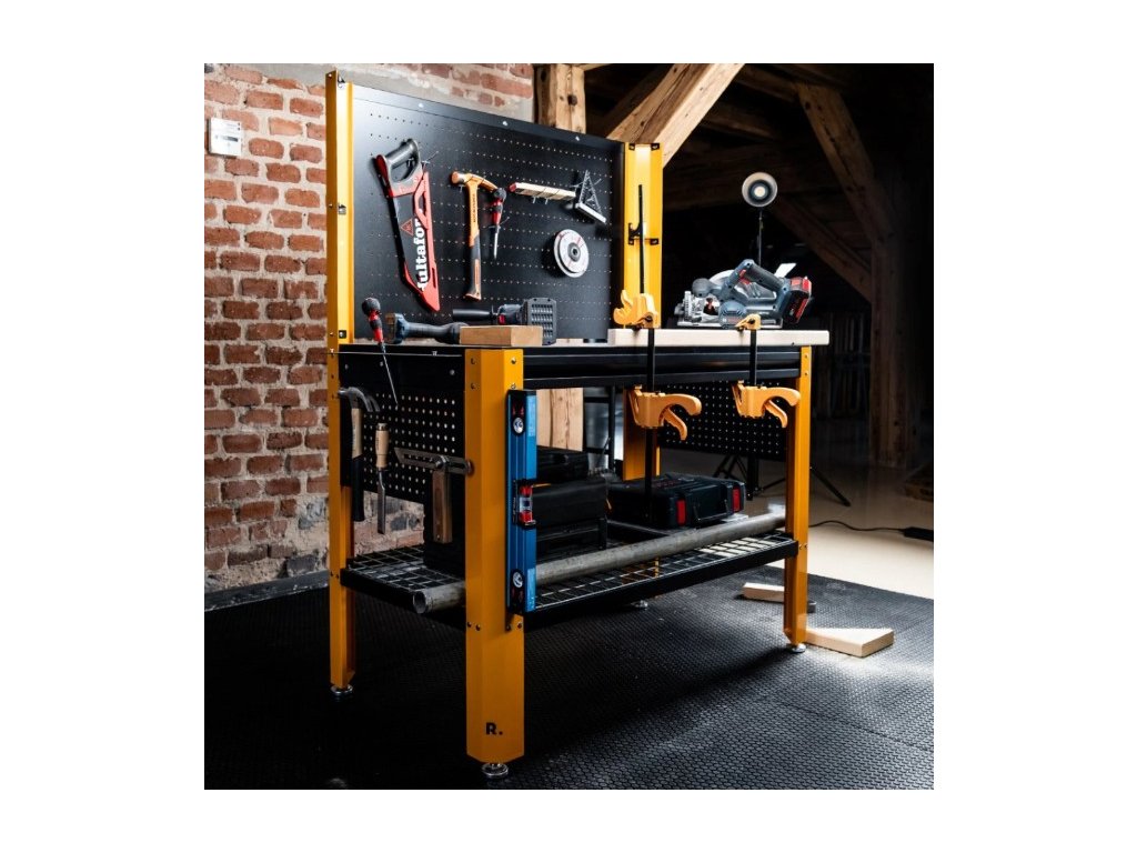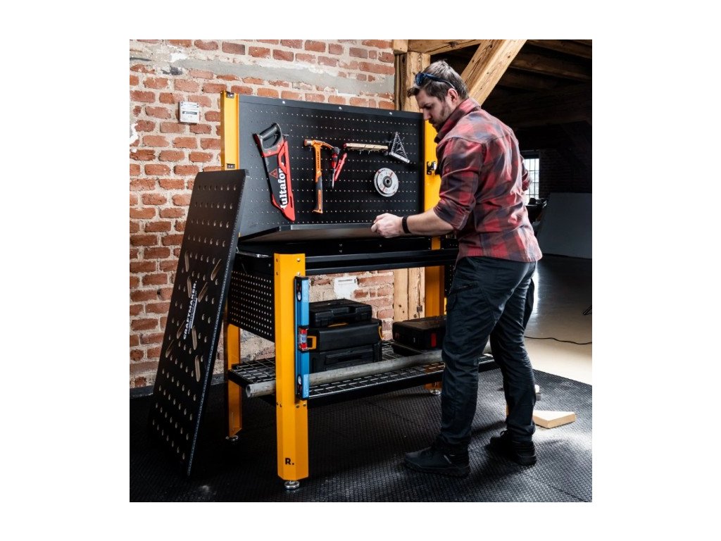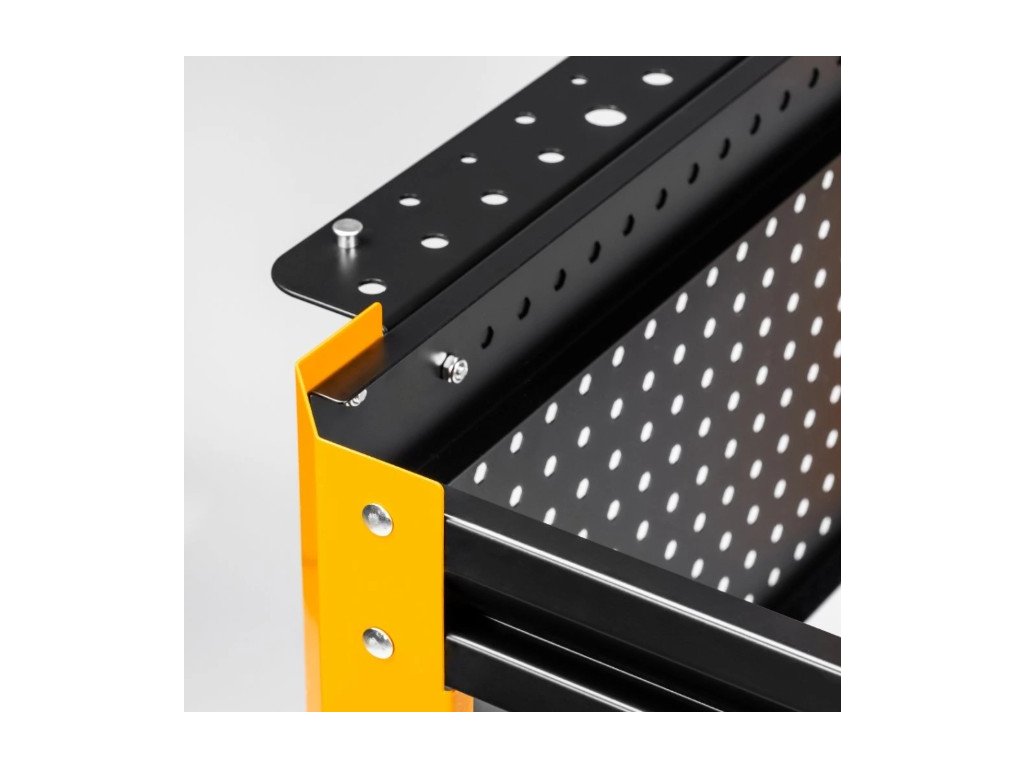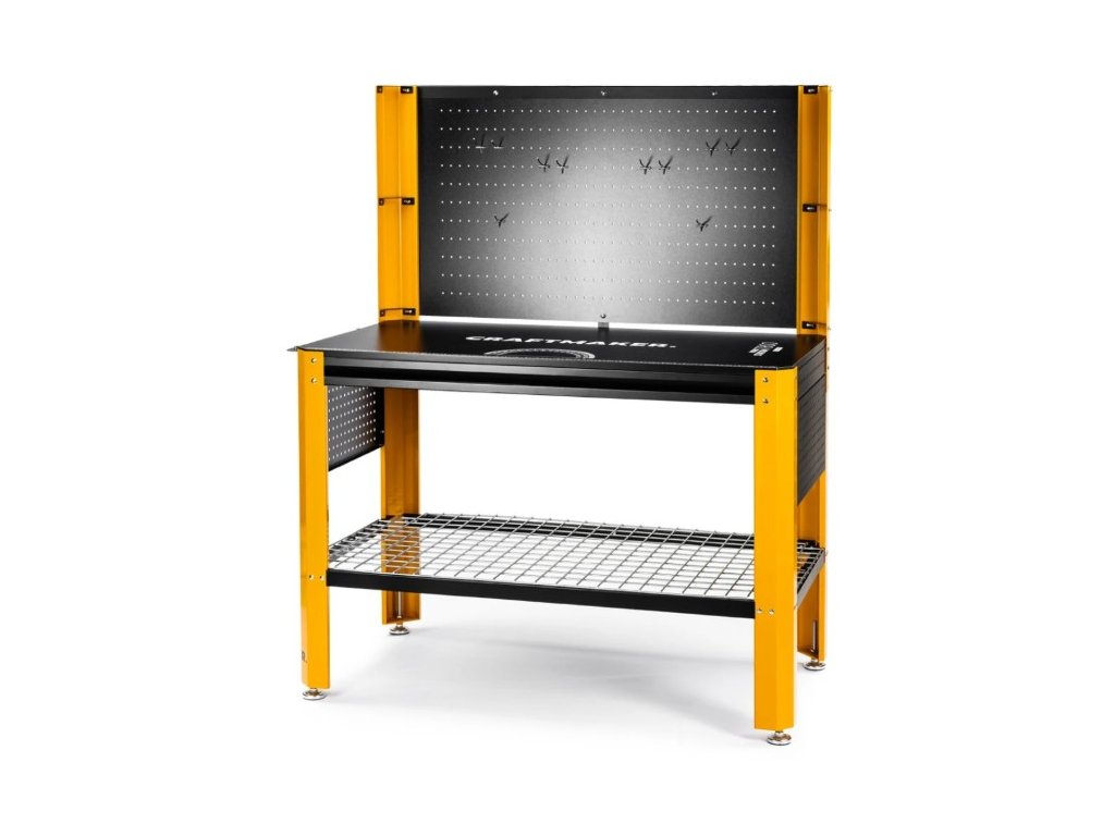 Robustní dílenský stůl Work Station T800 od značky CRAFTMAKER, který vám udělá pořádnou službu. Promyšlený ponk s řadou funkcí, které oceníte. Odkládací ocelový rošt pod pracovní plochou. Metrická stupnice v milimetrech na pracovní desce. Pegboard - děrovaná zadní stěna pro odkládání a organizaci nářadí - díky tomu máte pracovní plochu stolu stále uklizenou a přehlednou. Ocelová konstrukce osazená MDF pracovní deskou s odolným laminátem v černé barvě. Stůl je vhodný k řezání, lepení, sestavování menších kusů nábytku, broušení pilníky nebo flexou. Můžete na něj také umístit dílenský svěrák. Další velkou výhodou tohoto stolu je, že má vyměnitelné pracovní desky a v naší nabídce naleznete 2 druhy - plnou bez otvorů a děrovanou pro bench dogy a svěrky.
