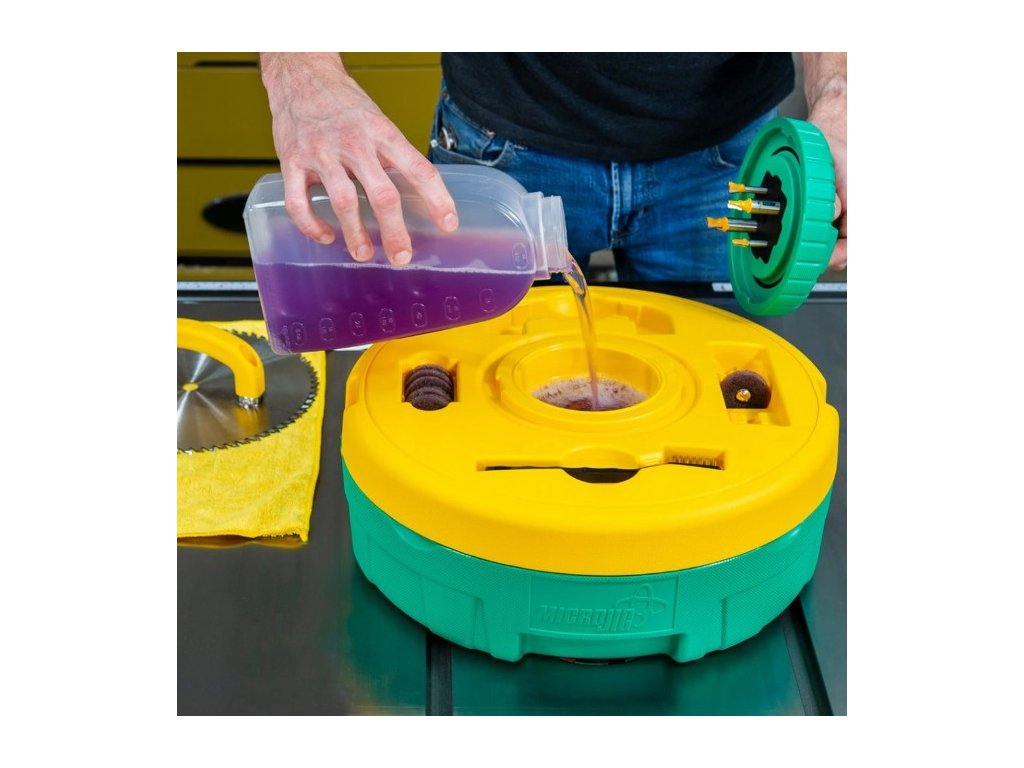 Velká sada pro čištění pilových kotoučů a bitů BLADECLEAN je nejrychlejší, nejbezpečnější a nejpříjemnější způsob čištění pilových kotoučů a frézovacích bitů. Špinavý pilový kotouč či bity zatěžují pilu či frézu, vytvářejí více tepla a často jsou mylně považovány za tupé. Vyhněte se broušení, když to není potřeba a pořádně je vyčistěte s čistícími podložkami z oxidu hlinitého.
