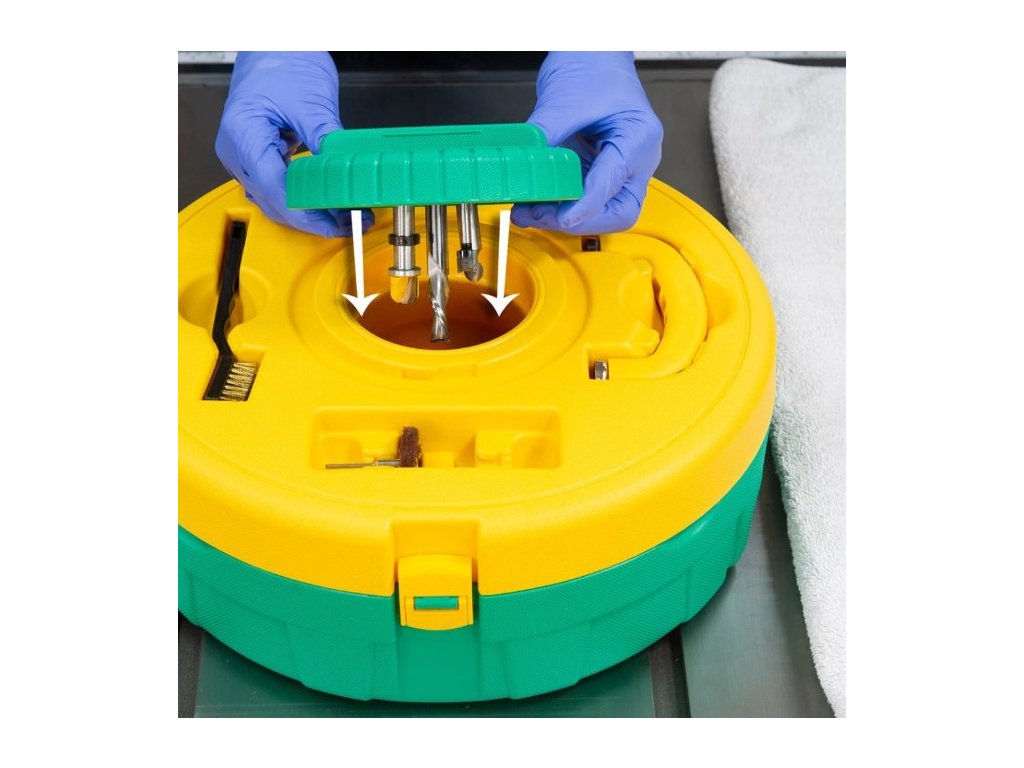 Držák frézovacích bitů umožňuje v rekordním čase namočit a vyčistit až pět bitů pomocí přiložených čisticích kotoučů. Kompatibilní s velikostmi bitů 1/4", 1/2", 6 mm, 8 mm a 12 mm.