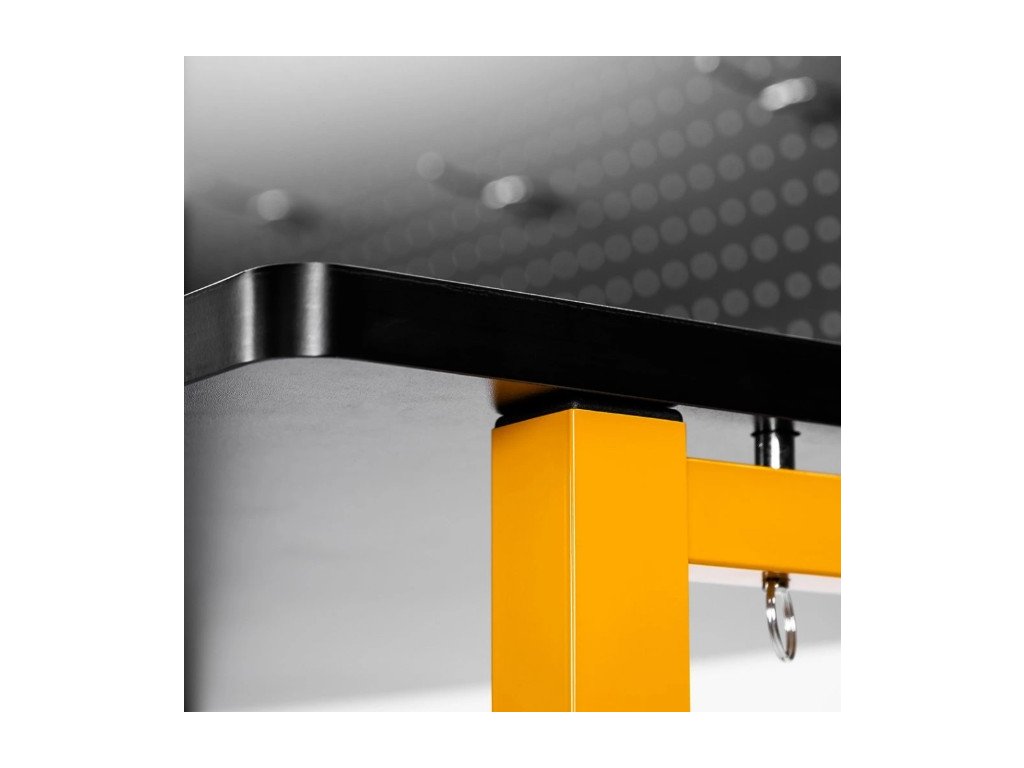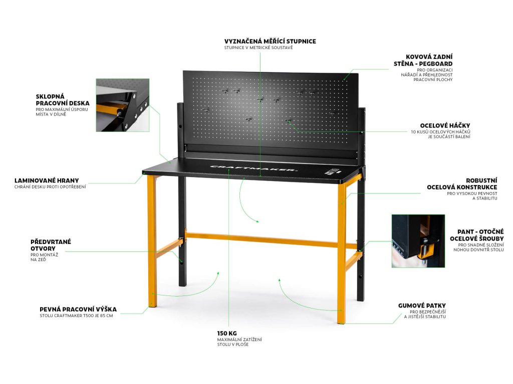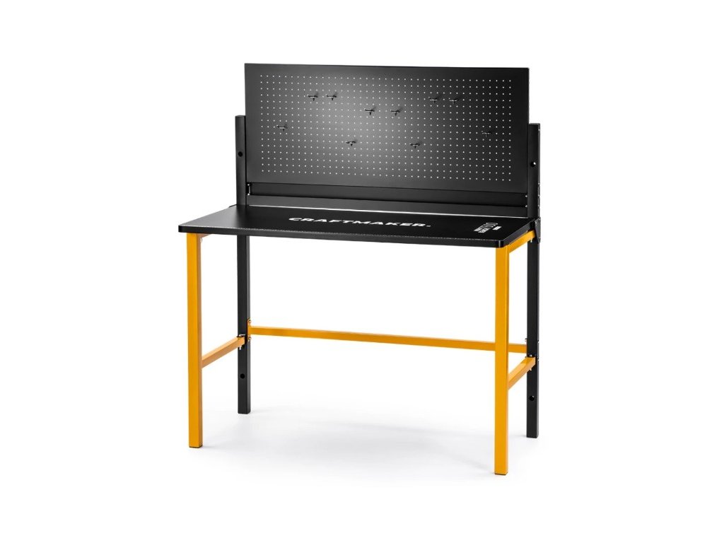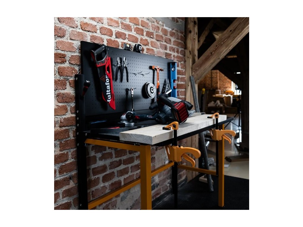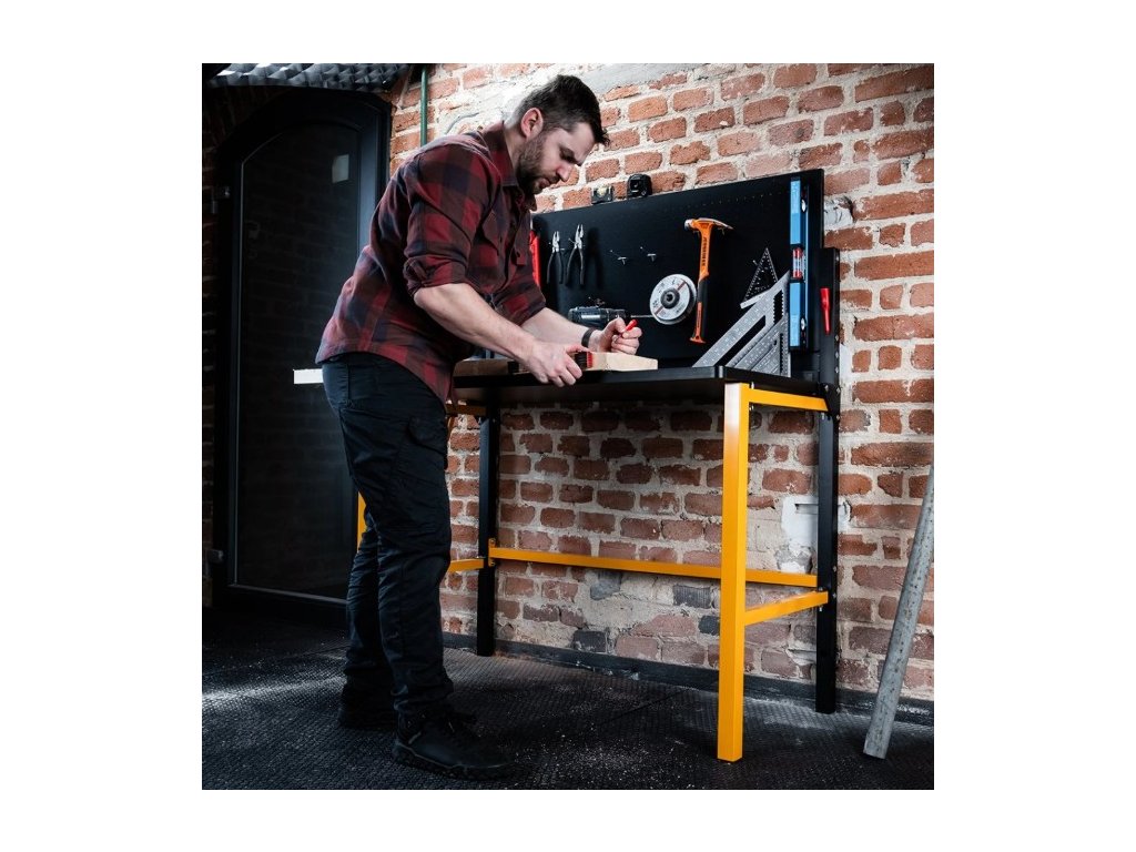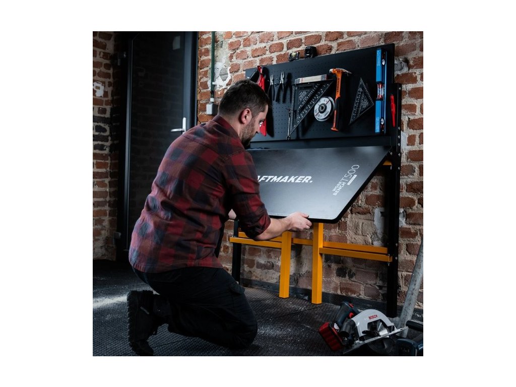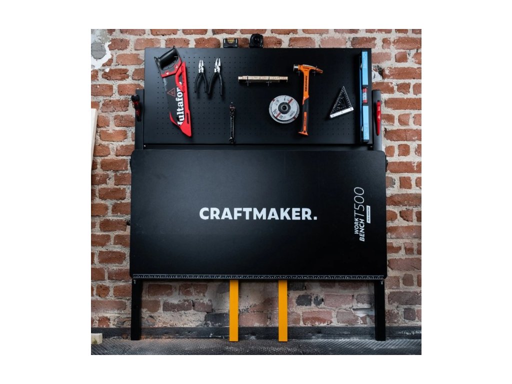 Skládací dílenský stůl Work Bench T500 od značky CRAFTMAKER je odolný stůl s ocelovou konstrukcí a MDF pracovní deskou opatřenou odolným laminem. Hlavní výhodou tohoto stolu je jeho skladnost - po dokončení prací jednoduše přizvednete pracovní desku, přední nohy složíte do středu a pracovní desku spustíte dolů. Nářadí zavěšené na horní kovové děrované desce můžete nechat. Stůl vám poslouží k následujícím činnostem: řezání, broušení, lepení a mnoho dalších řemeslných a kutilských činností.