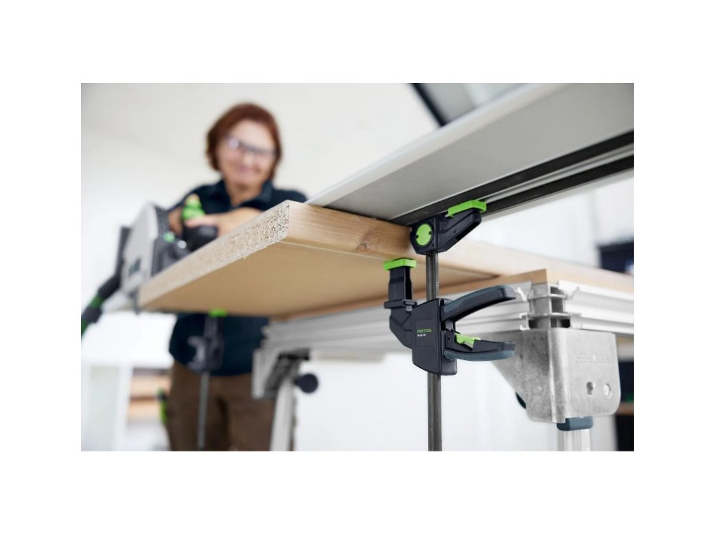 Jednoruční svěrka FS-EZ pro bezpečné upevnění vodicí lišty a pro upínání nebo rozepření obrobků.