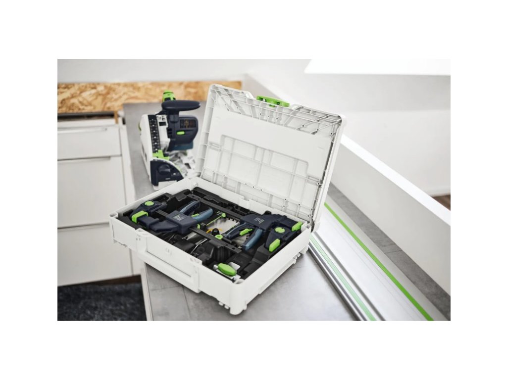 Tato souprava představuje perfektní doplněk k ponorné pile: díky ukazateli polohy zanoření se spolehlivě trefíte do přesného bodu vstupu a výstupu pilového kotouče při jakékoli hloubce řezu. Jednoduše ho nasaďte shora na drážku vodicí lišty a upevněte. Poté nastavte stupnici vyznačovacího ukazatele na nastavení hloubky ponorné pily, vyrovnejte podle nárysu a proveďte výřezy přesně tam, kde potřebujete. S odpovídajícími jednoručními svěrkami můžete vodicí lištu připevnit k obrobku jediným pohybem, což umožňuje bezpečnější a kontrolovanější práci. V Systaineru je také místo pro pilové kotouče a spojky FS, takže máte systémové příslušenství vždy po ruce.