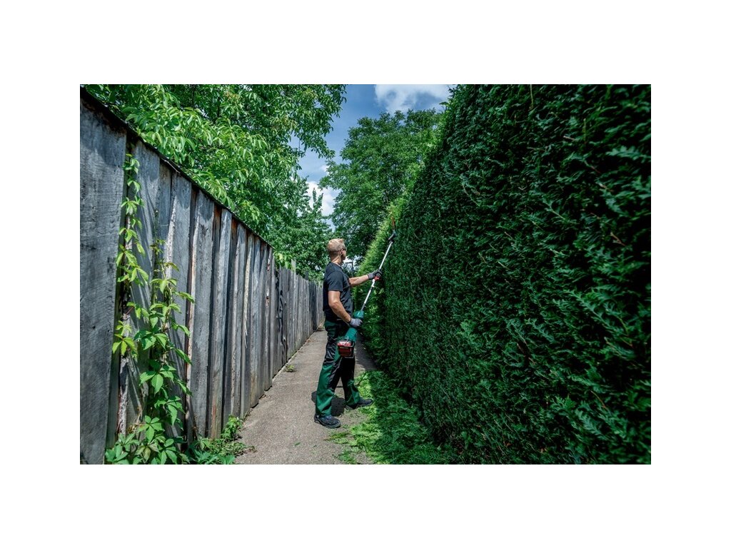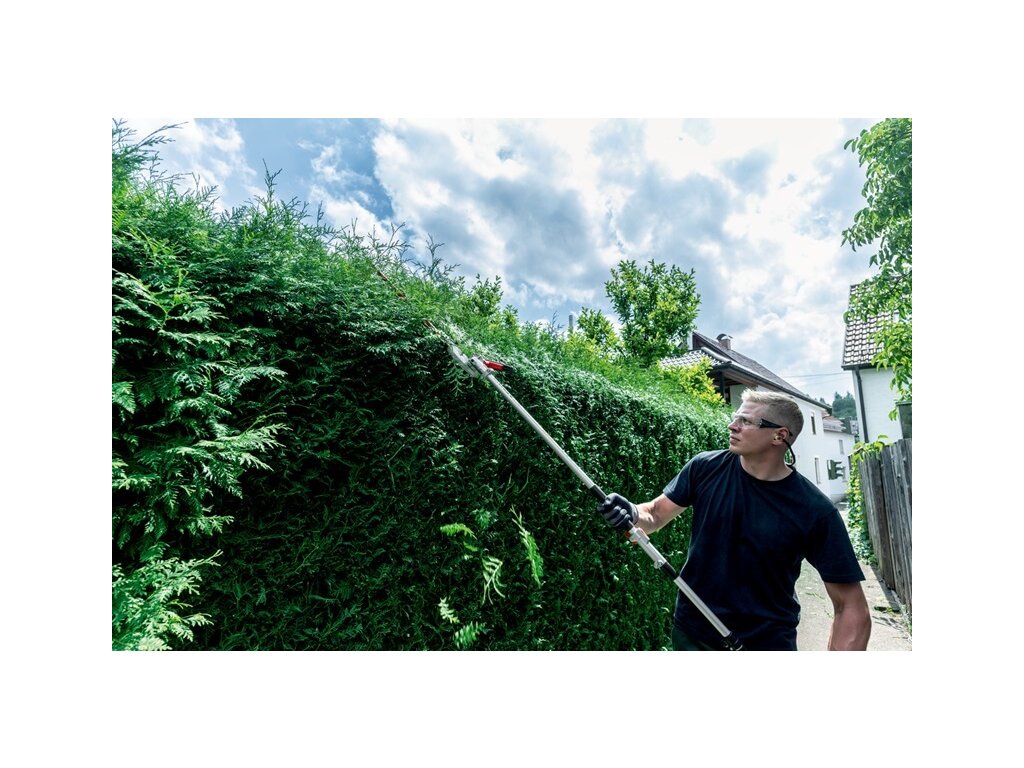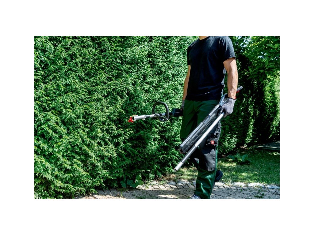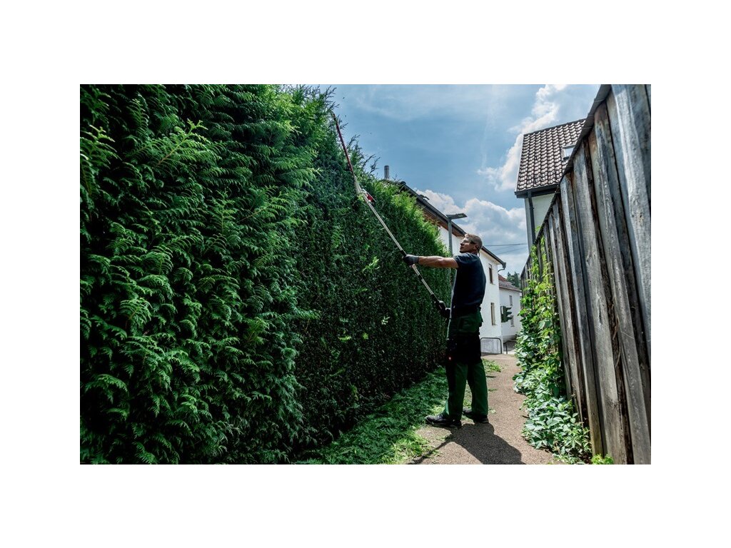 Stříhání vysokých živých plotů a keřů s nástavcem s nůžkami na živý plot multifunkčního systému Metabo, „all-in-one“ řešení pro spoustu zahradnických prací.Spolu s akumulátorovým multifunkčním pohonem MA 36-18 LTX BL Q se jedná o ekologický, tichý systém, ideální pro prostory citlivé na hluk.