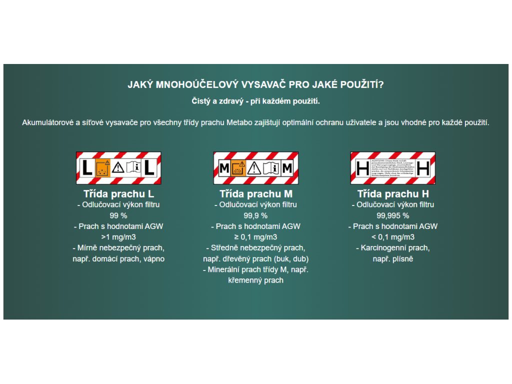 Ochrana uživatele: Certifikace podle normy EU pro prach třídy L.