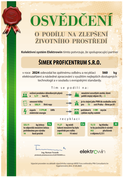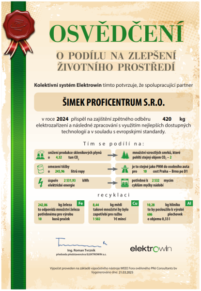 Osvědčení o našem přínosu životnímu prostředí za rok 2024