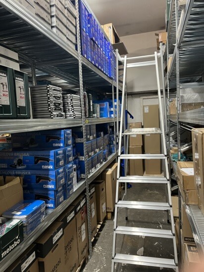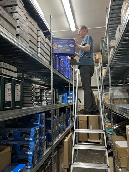 Do skladu jsme zakoupili novou žebříkovou plošinu ZARGES se zábradlím pro práci ve výškách. Regály jsou opravdu vysoké a zboží hodně. Skladníkům a expedientům jsme tím zlepšili ergonomii a bezpečnost práce v horních policích regálů.