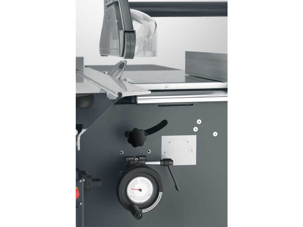 CE-provedení: Ochranný kryt pro max. průměr pilového kotouče 315 mm, upevněný na rozpínacím klínu, s odsávací hadicí nad hlavním pilovým kotoučem.