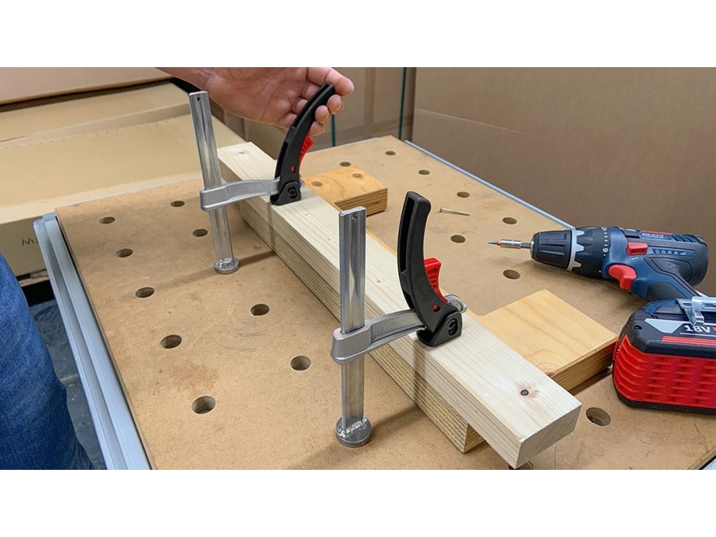 upínací prvek na MFT dílenské stoly s vrtanou dřevěnou pracovní deskou
