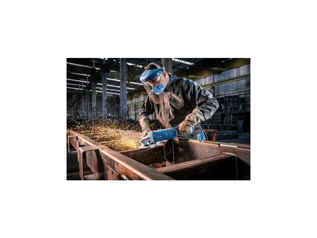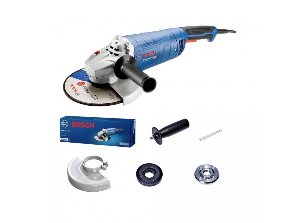 Úhlová bruska GWS 2400 J Professional 230 mm s výkonným 2400 W motorem je speciálně navržena pro náročné řezání a úběr materiálu. Úhlová bruska je dodávána s ochranou proti neúmyslnému startu a pozvolnému rozběhu. Měkká a ergonomická rukojeť umožňuje větší pohodlí uživatele a standardní boční rukojeť je součástí dodávky. Řeže a brousí různé materiály včetně kovu, betonu a kamene. Je kompatibilní s prachovým nástavcem Bosch Professional GDE 230 FC-S.