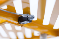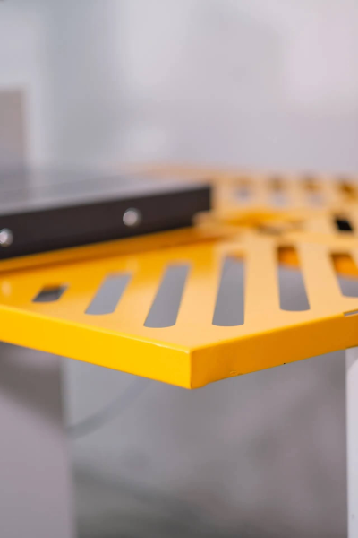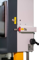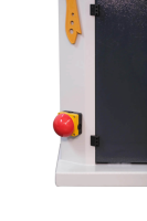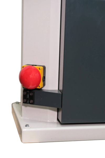 - skládací mechanické zábrany pro dodržení bezpečné vzdálenosti s bezpečnostním vypínačem + nouzový vypínač umístěný u podstavce stroje pro okamžité vypnutí stroje rukou nebo nohou;