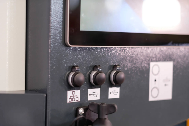- núdzové vypínače umiestnené pod pracovnou plochou aj pri podstavci stroja na okamžité vypnutie stroja rukou alebo nohou.