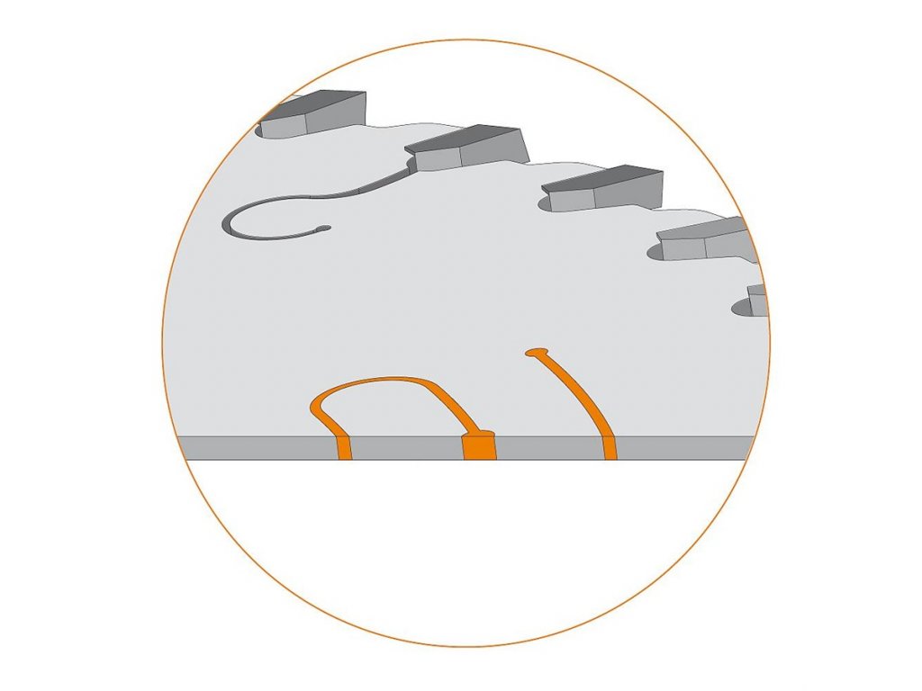 Pilový kotouč pro pily s předřezem. Kotouč s chromovaným povrchem, který redukuje ulpívání zbytků lepidla a pryskyřice na těle kotouče. Trapézové zuby z extra tvrdého tvrdokovu pro řezání lamina, dřevotřískových desek a MDF. Má tlumící drážky vyplněné oranžovým polyuretanem pro snížení vibrací a hlučnosti. Vysoká životnost.