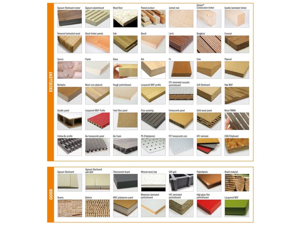 Dřevěné materiály, překližkové materiály, dřevotříska, dřevovlákna, lamina, ALU a PVC, materiály z minerálních pojiv.