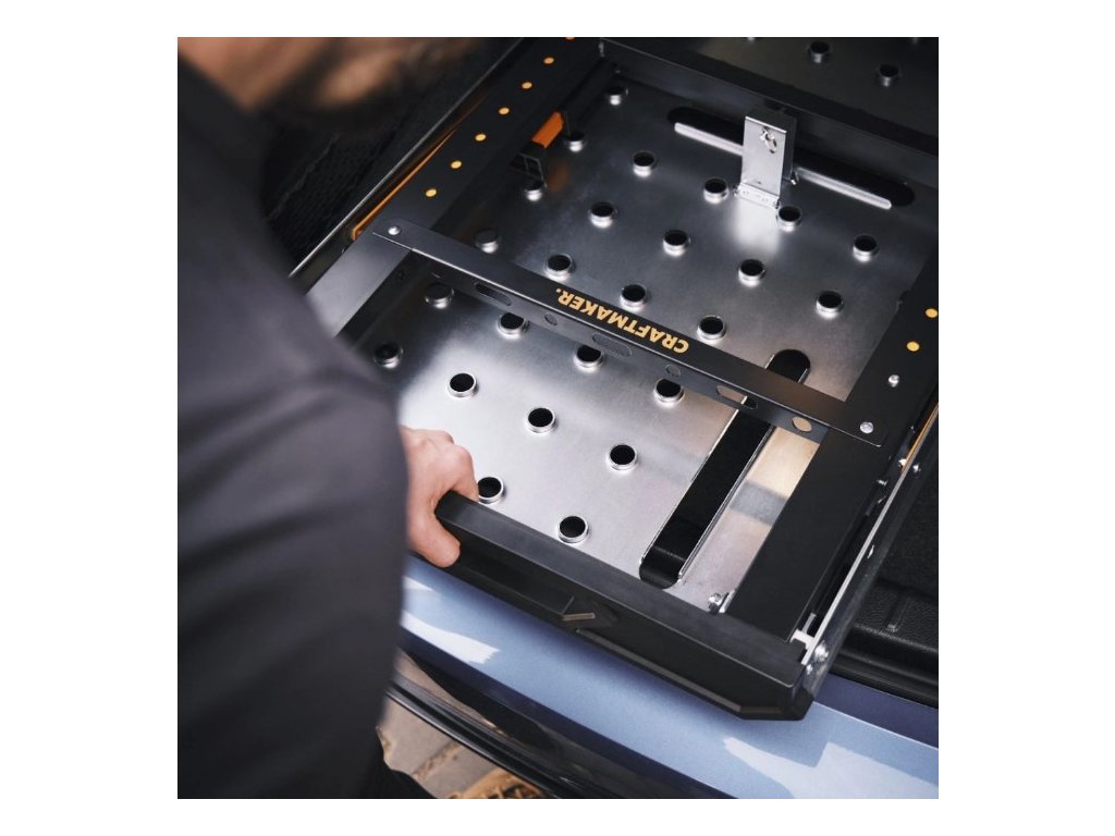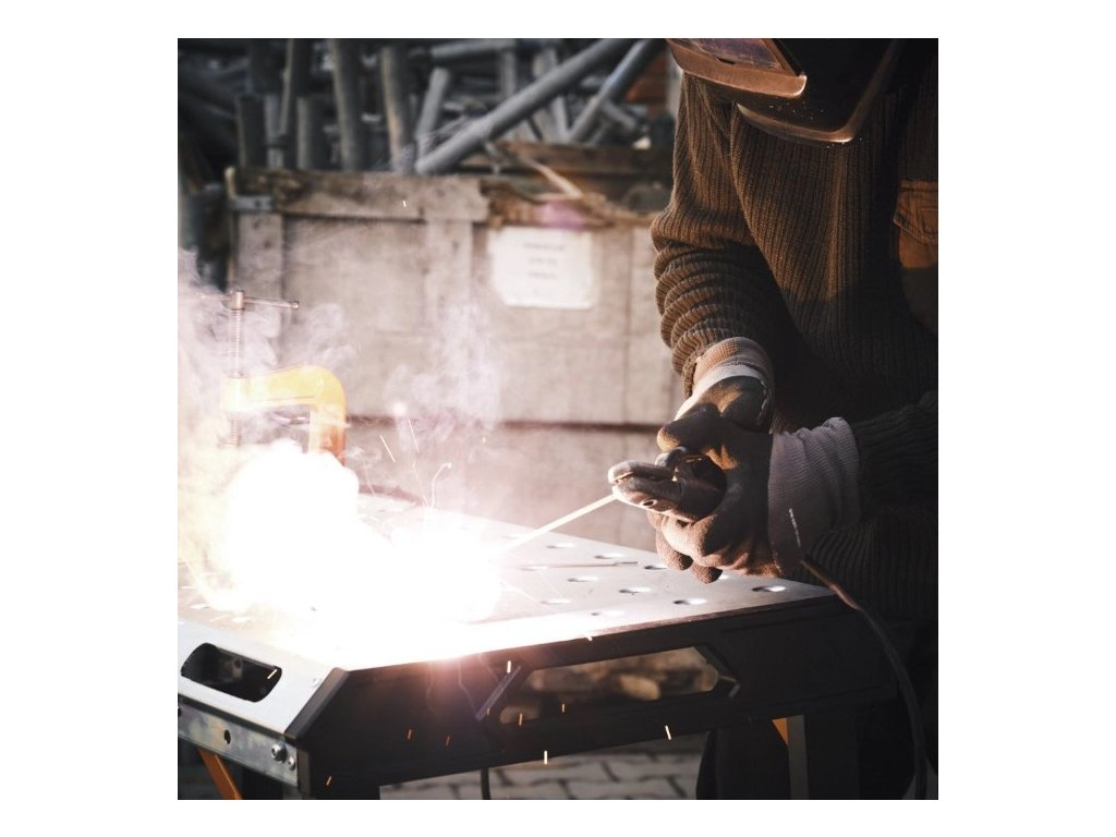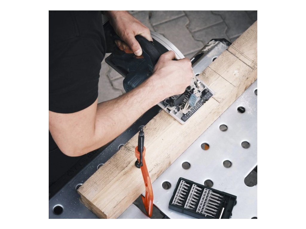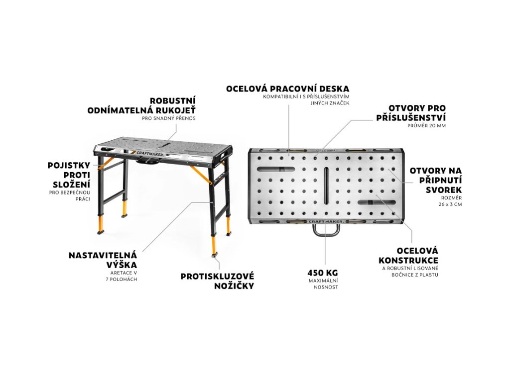Odolná ocelová nerezová pracovní deska s chytře umístěnými otvory pro zarážky, svorky, benchdogy a magnety. Výškově nastavitelné stabilní nohy s příčníky pro odkládání materiálu. Kovové pogumované madlo pro snadné přenášení. Nastavitelná pracovní výška od 70 do 93 cm. Maximální nosnost 450 kg. Rychlé rozložení a složení do tvaru kufříku - po složení nezabírá mnoho prostoru. Snadno se tak vejde do kufru auta či kůlny. Pro řezání, vrtání, broušení a další řemeslné práce. Horní otvory na pracovní desce mají dva tvary - kruhové a oválné.