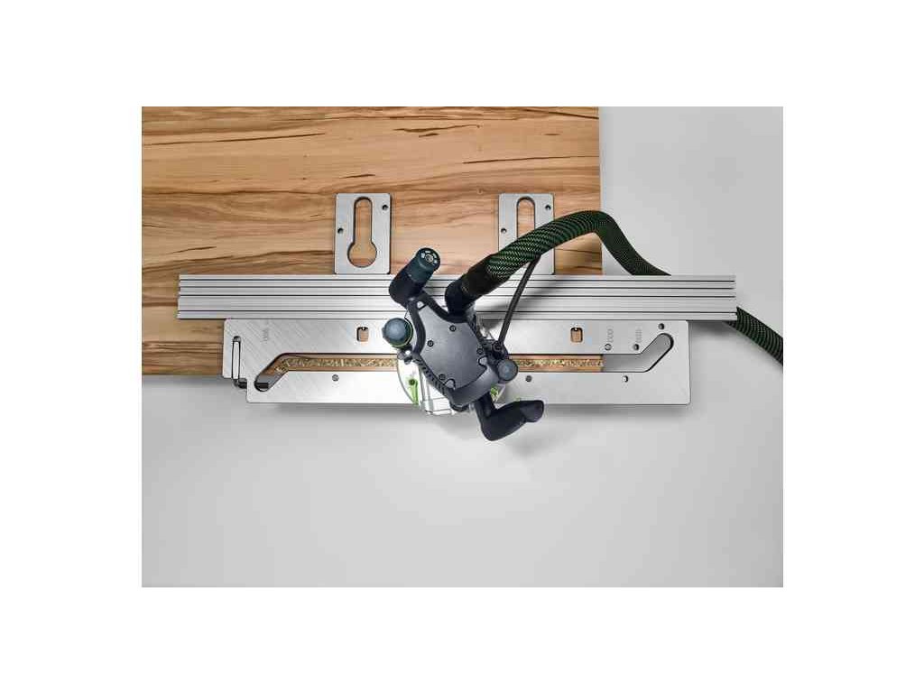 Dodatečně se dvěma volně polohovatelnými frézovacími šablonami pro zapuštění běžného spojovacího kování na dolní straně desky.