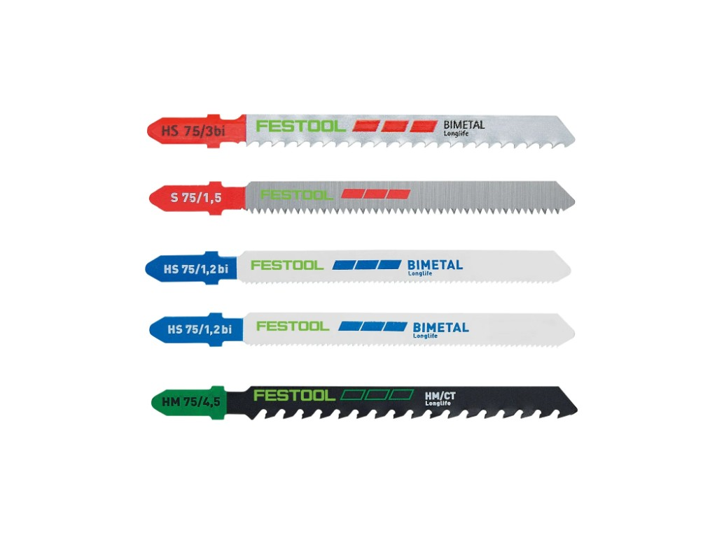 Díky barevnému rozlišení Festool lze rychle najít správný pilový kotouč nebo pilový plátek: červená barva znamená řezání plastu, modrá řezání kovu a zelená řezání stavebních a abrazivních materiálů.