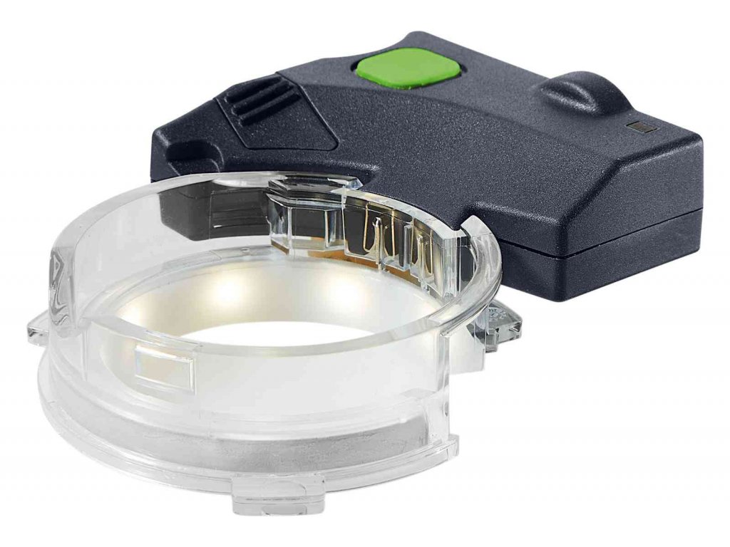 LED světelný kroužek je integrovaný přímo v základní desce a zajišťuje kompletní osvětlení bez stínu přímo u obrobku. Samostatnou akumulátorovou jednotku lze v případě potřeby sejmout a nabít prostřednictvím rozhraní USB-C. Světlem lze dovybavit všechny OF 1010 REBQ od data výroby 2021-09.