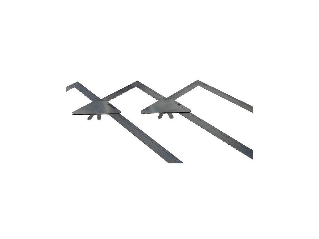 Rýsovací úhelník na schody, vyleptaná, oboustranná milimetrová stupnice na pravítku, ideální k naměřování bočnic na šroubovitých schodech, stabilní propojení úhelníků s napínacími zámky.