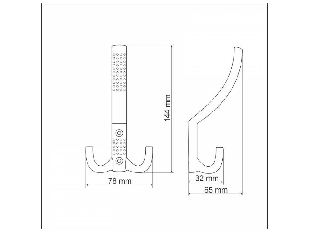 Kovový věšák v provedení satin chrom se dvěma háčky o šířce 78 mm, výšce 144 mm a hloubce 65 mm.