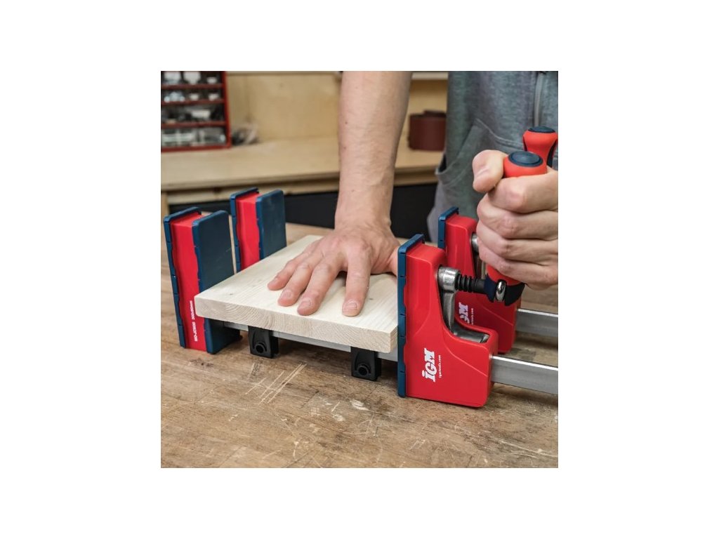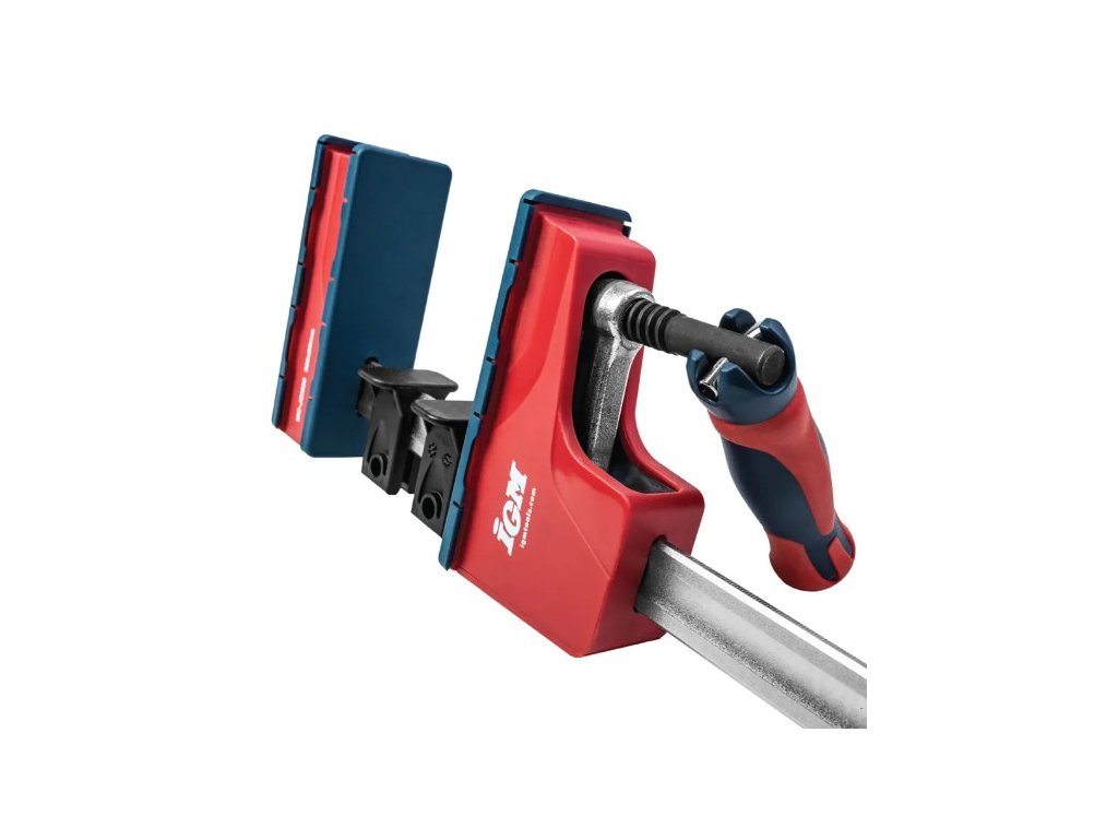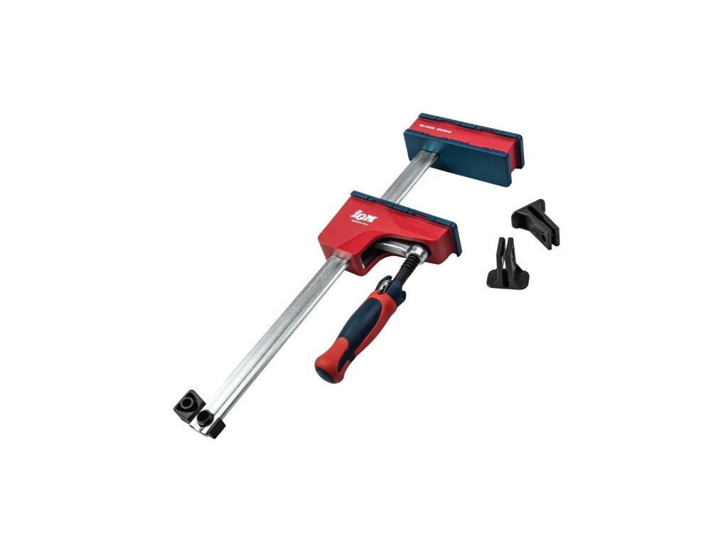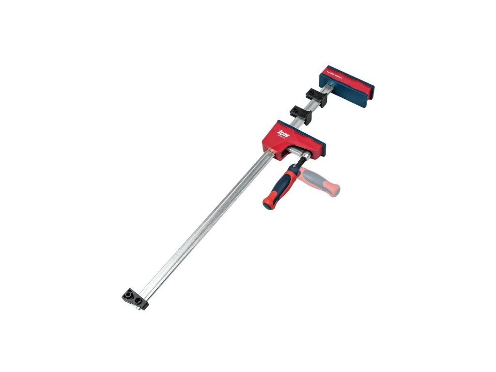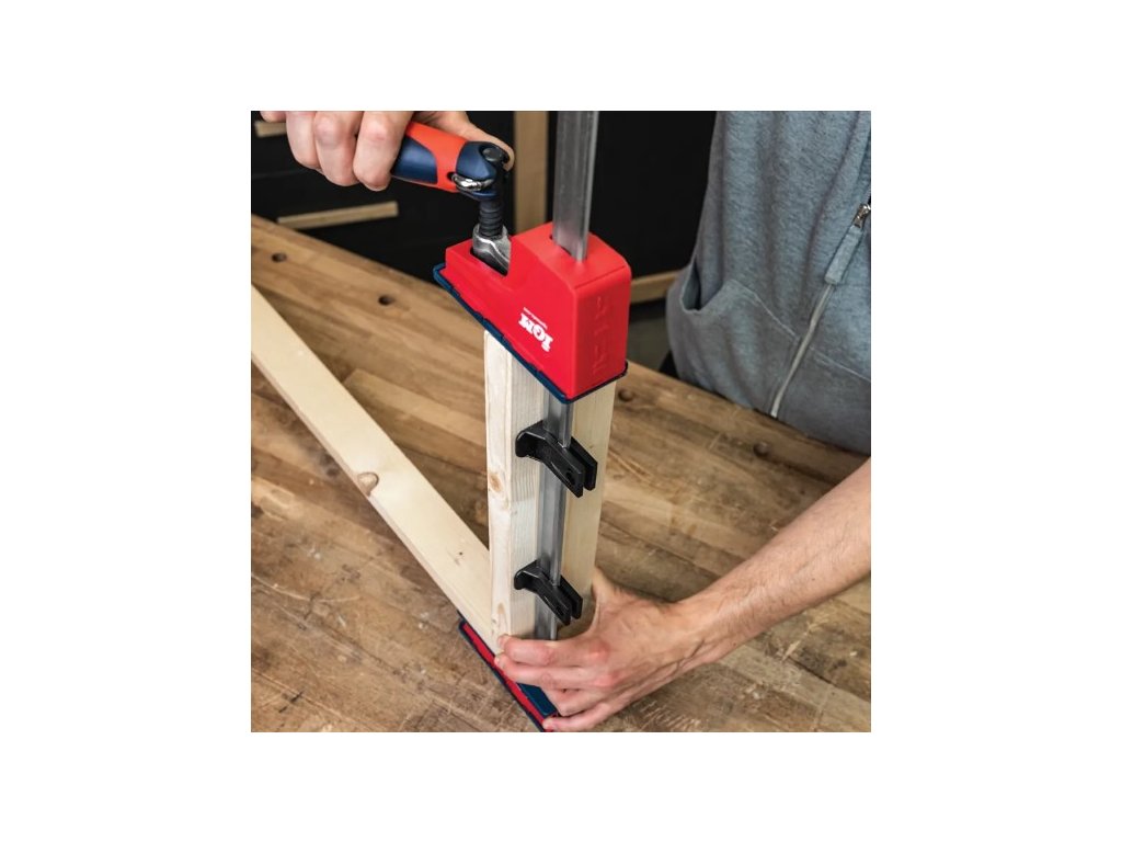Korpusové svěrky pro střední zátěž jsou určené především pro stahování lepených korpusů, lze je ale využít i pro stahování a rozpínání jakéhokoli materiálu. Díky jejich menší velikosti oproti HD korpusovým svěrkám je oceníte při stahování menších a středních dílců. Pogumovaná výklopná rukojeť, díky které jednoduše dosáhnete vysoké upínací síly až 460 kg, umožňuje pevně stáhnout korpus, zatímco lepidlo vytvrzuje. Vodicí tyč je vyrobena z pozinkované oceli tažené za studena a je výrazně profilovaná pro minimalizaci prohýbání. Čelisti z uhlíkové oceli jsou hluboké 90 mm, udržují konstantní úhel 90° i při zatížení a rovnoměrně roznáší tlak po celé upínací ploše. Čelisti jsou osazené plastovými kryty s velkou upínací plochou o šířce 47 mm, které je chrání proti lepidlu stékajícímu z lepeného dílce a které zároveň zabraňují poškození stahovaného materiálu. Odnímatelná spodní čelist umožňuje svěrku přeměnit na rozpěrku. Patentovaný protiskluzový posuv čelisti po tyči zajišťuje pevné zafixování v potřebné poloze. Abyste mohli korpusy lepit pohodlně i na pracovním stole, je svěrka vybavena třemi podpěrami na vodicí tyči, které ji drží stabilně na pracovní ploše. Mezi čelistmi se nachází dvě podpěry se zaoblenými rohy, které zabraňují poškození materiálu. Podpěra na konci vodicí tyče slouží jako zarážka čelistí, při přeměně na rozpěrku ji lze jednoduše odejmout.