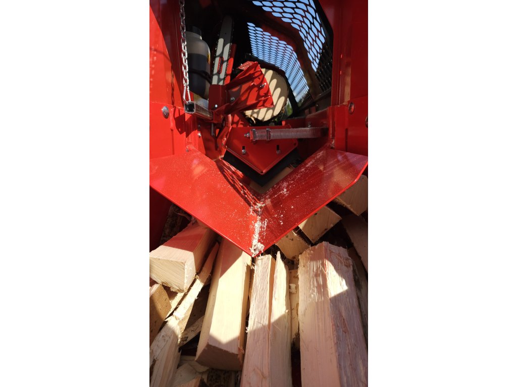 Řezanou délku je možné libovolně nastavit dle potřeby. Excentr na délkovém dorazu po uříznutí samovolně odjede, tak aby bylo zajištěno rychlé a bezproblémové propadnutí dřeva do štípací komory.