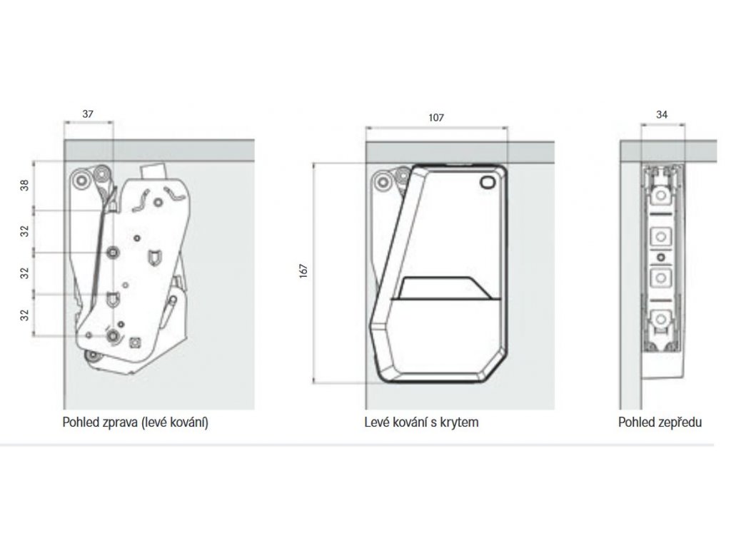 Kování pro výklopná dvířka Free mini, typ C. Úhel otevření dvířek 107°.