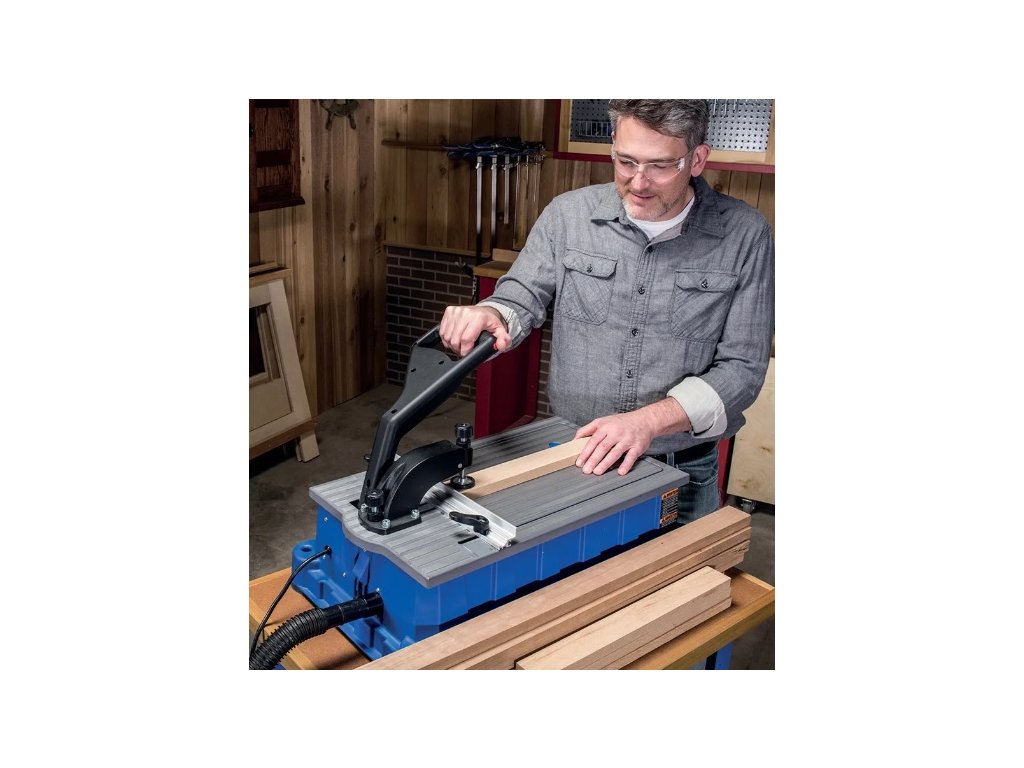 S tímto strojem můžete opakovaně vyvrtávat skryté spoje rychle a přesně. Zatáhnutím za ovládací rukojeť se spustí výkonný 110V motor, obrobek se pevně upne na stole a stačí už jen vrtat. Vždy stejný a přesně umístěný skrytý spoj vyvrtáte v materiálech o tloušťce 12-38 mm. Pro přesné vyvrtání skrytých spojů je stroj vybavený pravítkem a dorazy pro opakované vrtání. Na stole jsou navíc vyryté značky usnadňující umístění pravítka podle tloušťky materiálu.