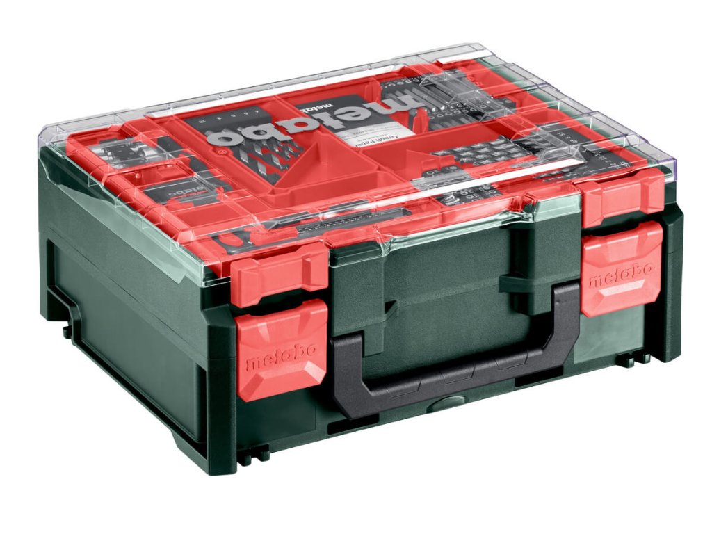 Mobilní dílna (74 kusy): 5 vrtáků na dřevo (4/5/6/8/10 mm), 14 vrtáků HSS (1,5/1,5/2/2/2,5/3/3/3,5/4/4,5/5/5,5/6/6,5 mm), 20 šroubovacích bitů délky 25 mm (PH1/PH2/PH2/PH3/PZ1/PZ2/PZ2/PZ2/PZ3/H3/H4/H5/H6/T15/T20/T25/T30/S4/S5/S6), 10 šroubovacích bitů délky 50 mm (S4/S5/S6/PZ1/PZ2/PZ3/T15/T20/T25/T30), 10 šroubovacích bitů délky 75 mm (S4/S5/S6/PZ1/PZ2/PZ3/T15/T20/T25/T30), držák bitů (60mm), 8 nástrčných klíčů (6/7/8/9/10/11/12/13 mm), záhlubník do dřeva (12,7 mm), středicí kolík (5x100 mm), řezací nůž se 2 náhradními čepelemi, svinovací metr (3 m/10"), tužka (HB), blok.