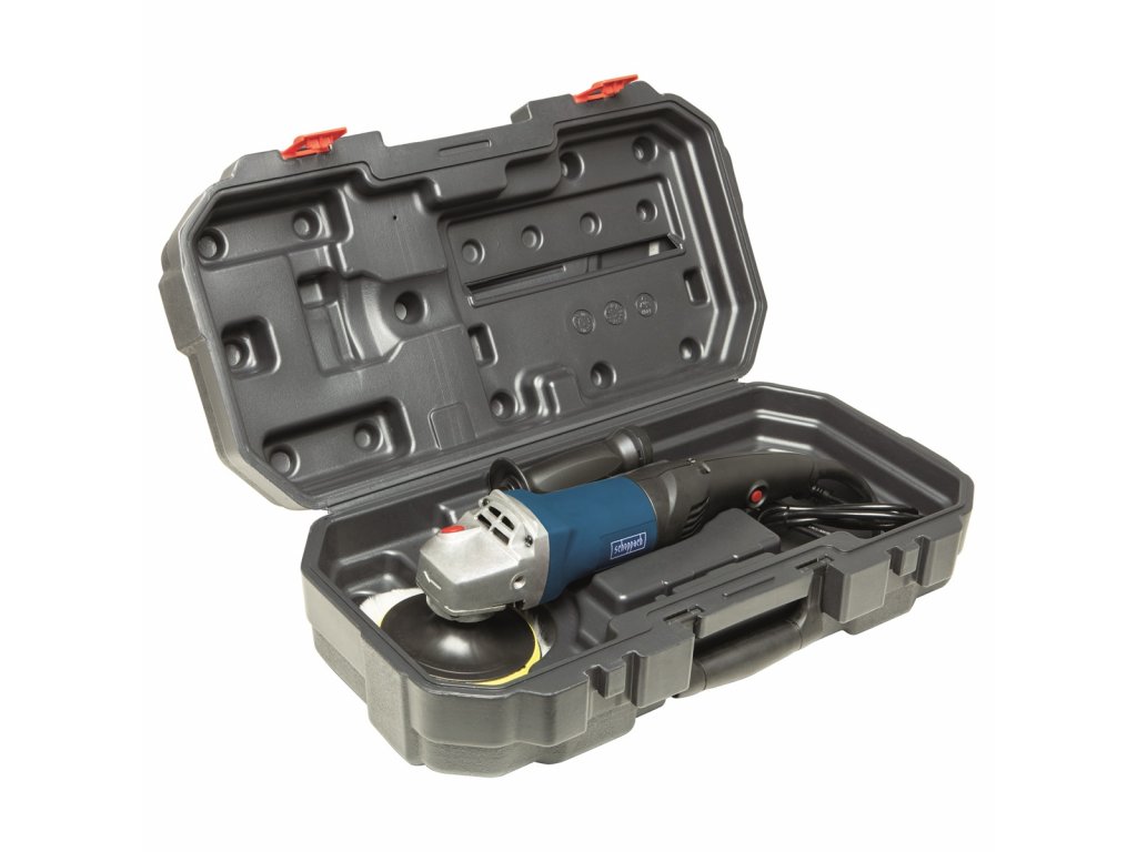 1x leštící kotouč, vlněný leštící návlek, postranní rukojeť, ochranný kryt, klíč, plastový kufr