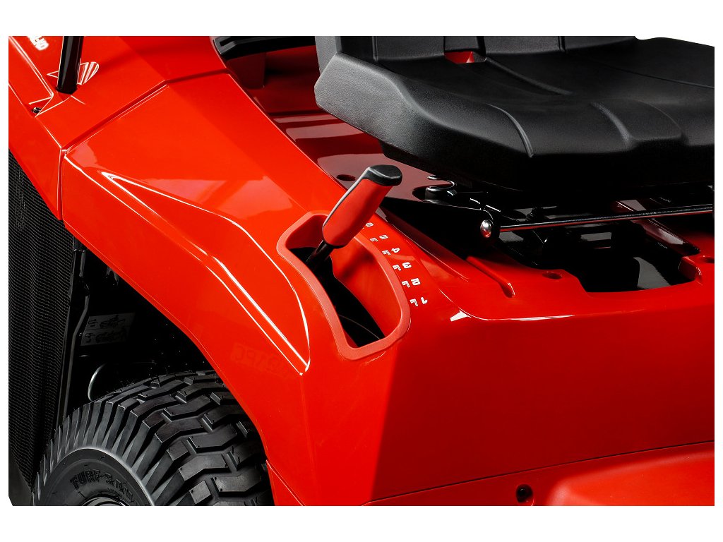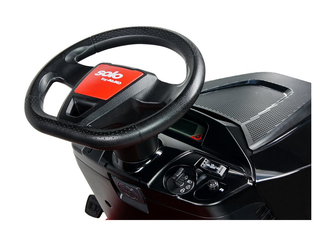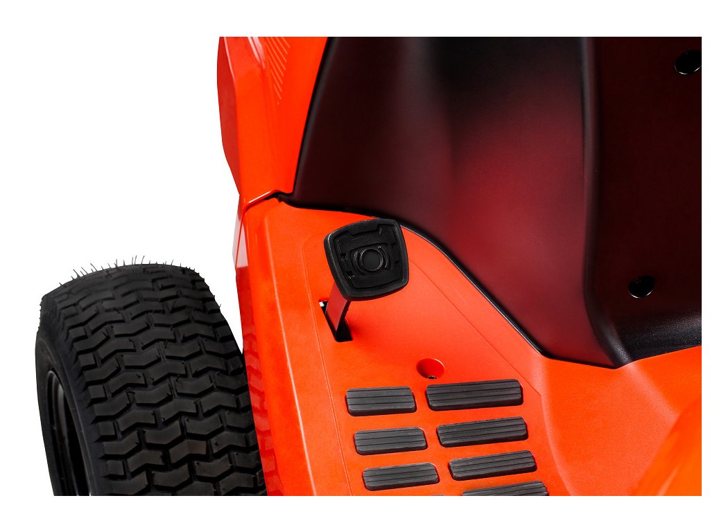 Zahradní traktor solo® by AL-KO T16-95.6 HD V2 je poháněn dvouválcovým motorem Briggs&Stratton o výkonu 9,6 kW. Výška sečení je snadno nastavitelná pákou v rozsahu 30 - 90 mm. Žací ústrojí s ocelového plechu se vyznačuje dlouhou životností a osvědčený dvounožový žací systém zaručuje perfektní střih trávníku. Žací ústrojí je také možné během chvíle demontovat, čímž je usnadněno jeho údržba nebo servis. Na přední část traktoru solo® by AL-KO T16-95.6 HD V2 je možné v zimě namontovat sněhovou radlici a díky dalšímu příslušenství jako zahradní válec nebo přívěsný vozík Vám Váš zahradní traktor poslouží při mnoha dalších činnostech. Robustní a zkrutuodolný ocelový rám z C-profilu zajistí dlouhou životnost traktoru. Volitelně může být dokoupen také přední nárazník. Velká kola traktoru o průměru 15“ vpředu a 20“ vzadu zajistí perfektní trakci na každém povrchu a snadné překonání nerovností. Posečená tráva je odváděna do sběrného koše o objemu 310 l, který lze snadno vysypat přímo ze sedadla řidiče pomocí teleskopické tyče, lze dokoupit i systém eletrického vysýpání koše. Zvukový signál upozorní na nutnost vyprázdnění koše. Dalšími komfortními prvky jsou ergonomicky tvarovaný volant a přehledně uspořádané ovládací prvky.