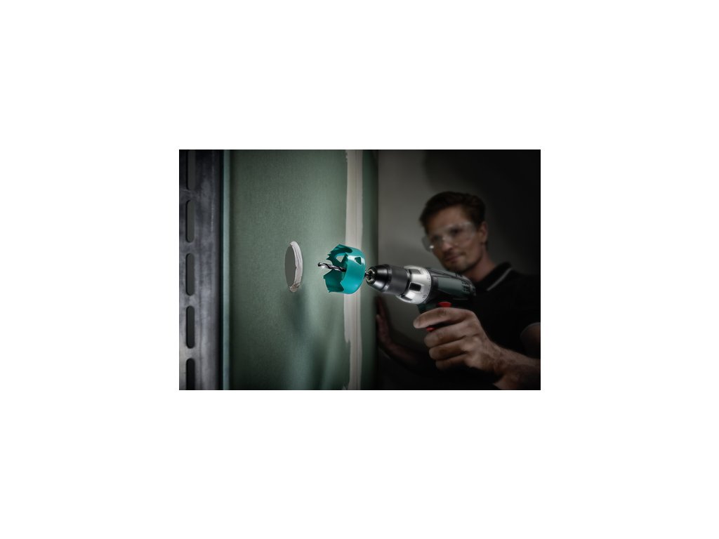 Tato děrovka z uhlíkové oceli s upínacím trnem je speciálně určena k použití u dřevěných desek a desek pro suchou stavbu (např. sádrokarton a OSB). Hloubka řezu činí 30 mm, takže můžete vrtat také dvojitě vyztuženými sádrokartonovými stěnami. Pomocí šestihranné stopky je možné děrovku rychle upnout do sklíčidla vrtačky nebo aku šroubováku. Děrovky z uhlíkové oceli můžete také použít u nářadí s uchycením ¼" nebo s držáky bitů. Středicí vrták (Ø 6 mm) s délkou 70 mm vám usnadní přesné vyvrtání otvoru. Díky třízubému seskupení má obzvláště dobré výsledky při použití s ​​méně výkonným akumulátorovým nářadím, protože při vrtání kladou jen minimální odpor. Speciální geometrie zubů se současně stará o jemné a čisté řezy. Při vrtání se vrtné jádro díky speciální pozici zubů obrousí tak, že je možné jej pak vyviklat a vyjmout bočními otvory v děrovce. Děrovka je certifikovaná sdružením TÜV – můžete se tak spolehnout na bezpečný, kvalitní produkt.