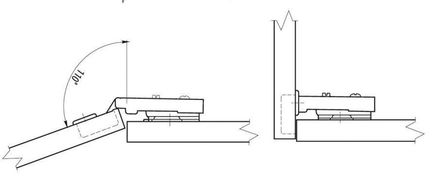 Naložené provedení nábytkového závěsu/pantu vypadá takto: dvířka jsou umístěna před bokem korpusu a po stranách zůstává pouze mezera, která představuje prostor, nutný pro bezpečné otevření.