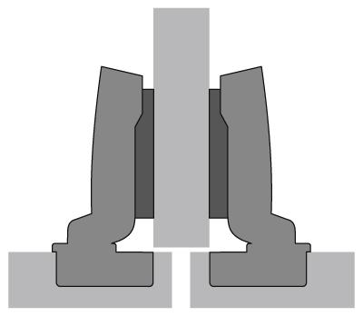 Naložené provedení nábytkového pantu/závěsu vypadá takto: dvoje dvířka jsou před mezistěnou skřínky, potřebná mezera se nachází mezi nimi.
